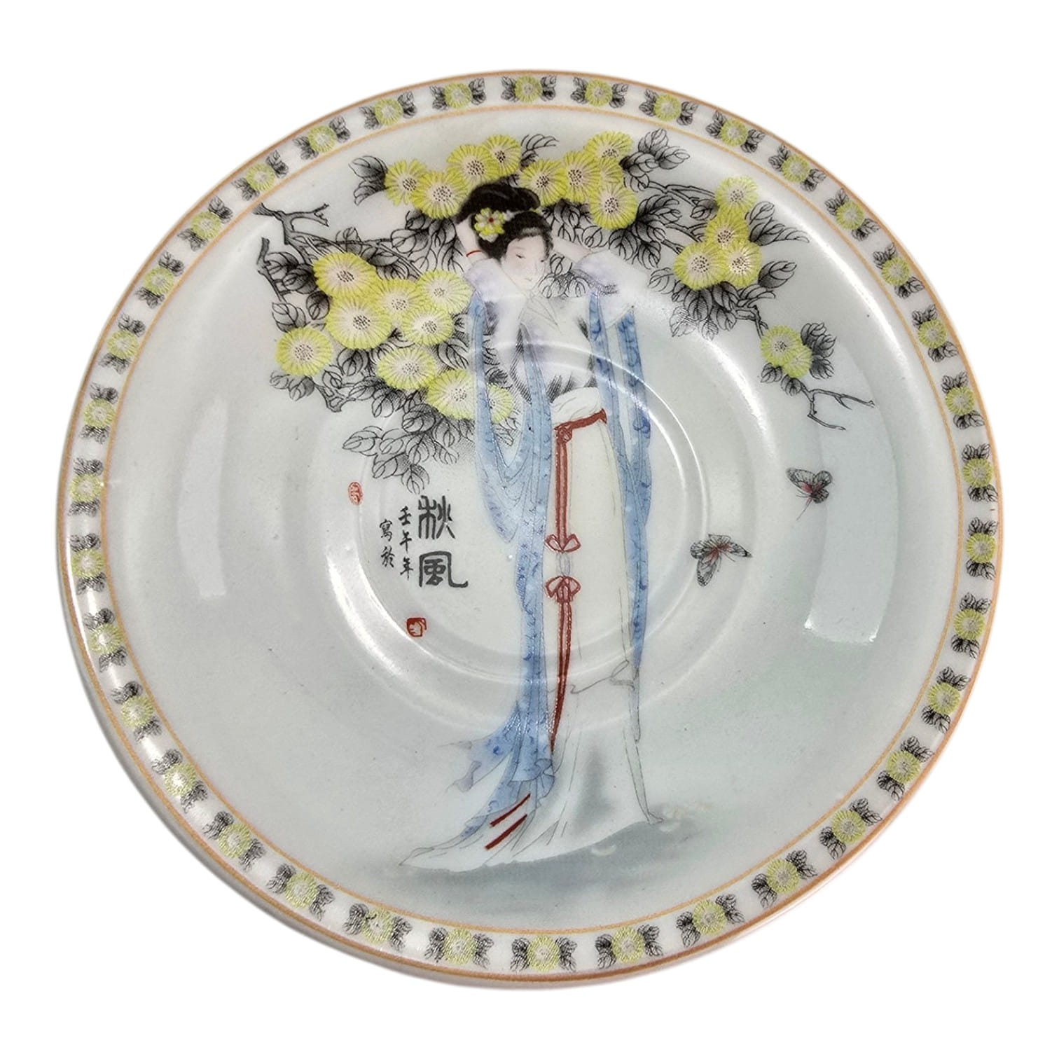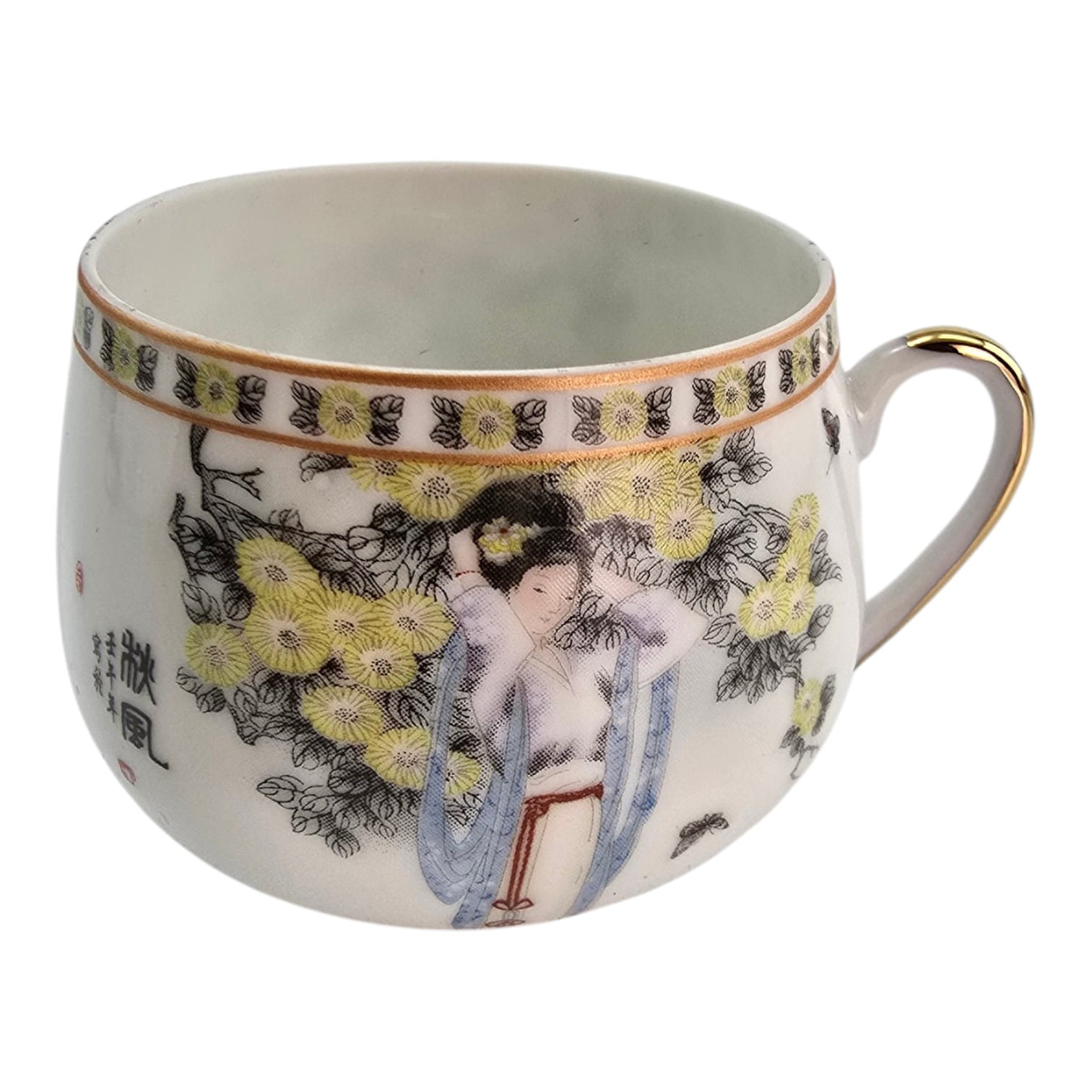 Каждая чашка и блюдце украшены нежным японским декором на белом фоне: традиционные девушки в кимоно среди цветущих деревьев и бабочек. Тонкий золотой орнамент по краю.