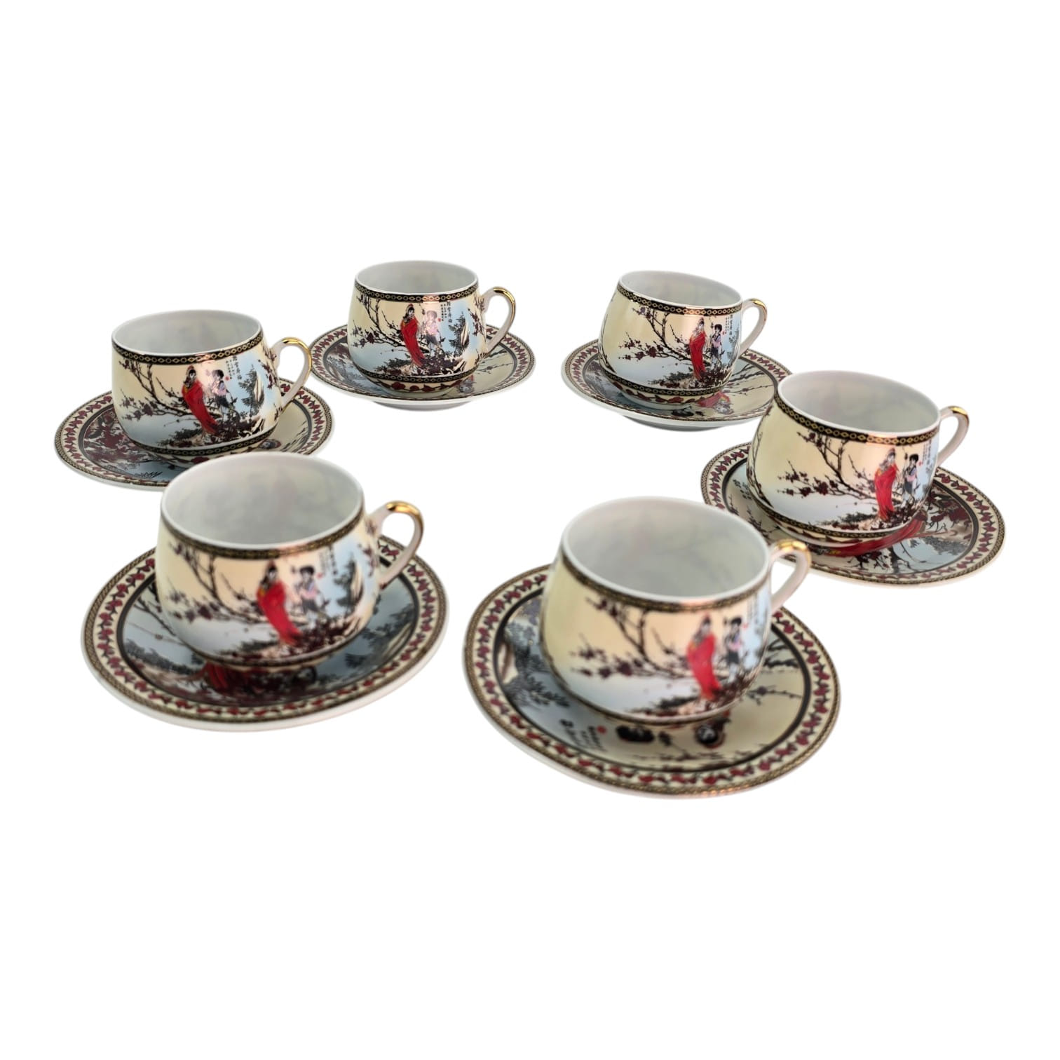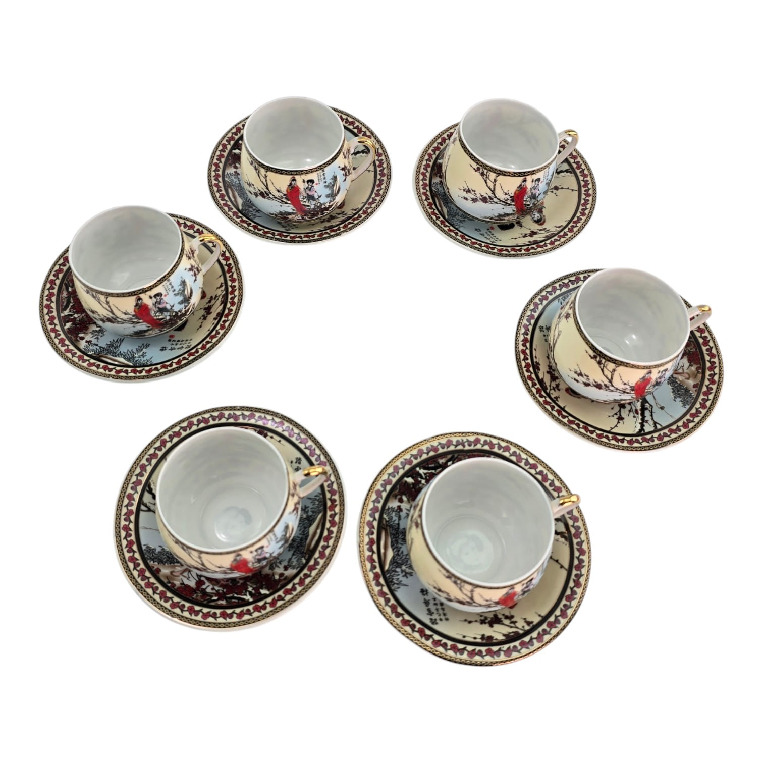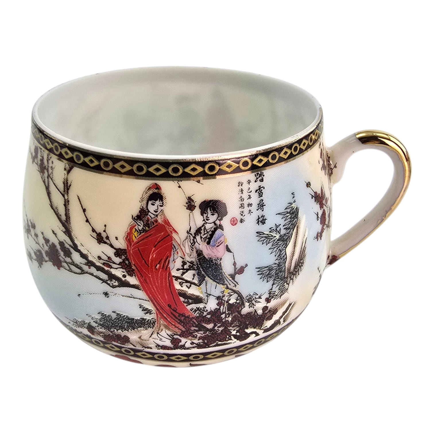 Каждая чашка и блюдце украшены классическим японским декором: девушки в кимоно на фоне зимнего пейзажа с цветущей сливой и красными птицами. Богатый золотой орнамент по краю на кремовом фоне.