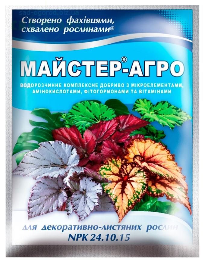 Мастер-Агро для декоративно-лиственных растений (25 гр) - эффективное водорастворимое, безхлорное комплексное удобрение с микроэлементами в форме хелатов. Применяется для корневой подкормки всех видов декоративно-лиственных комнатных и садовых растений: Алоказии, Аспидистры, Аспарагуса, Антуриума, Бегонии, Диффенбахии, Драцены, Сингониума, Кротона, Колеуса, Маранти, Монтсеры, Пеперомии, Плектрантуса, Плющей, Фатсии, Фитонии, Хлорофитума, Циссуса и др.