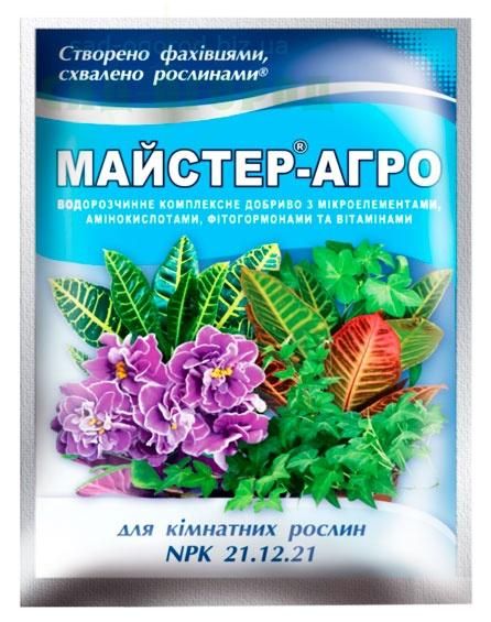 Мастер-Агро для комнатных растений (25 гр) - эффективное водорастворимое, безхлорное комплексное удобрение с микроэлементами в форме хелатов. Применяется для корневой подкормки всех видов комнатных, балконных и декоративно-лиственных культур.