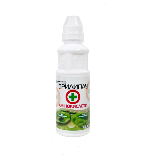 Прилипатель с набором аминокислот применяется в баковой смеси со средствами защиты растений, удобрениями и стимуляторами роста с целью равномерного распределения и удержания рабочего раствора на поверхности культур.