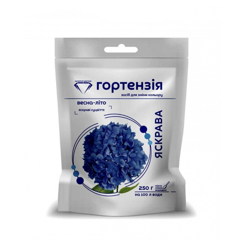 Меняет цвет крупноцветных цветущих гортензий из розового и светлого (бледно-голубого) на яркий голубой.