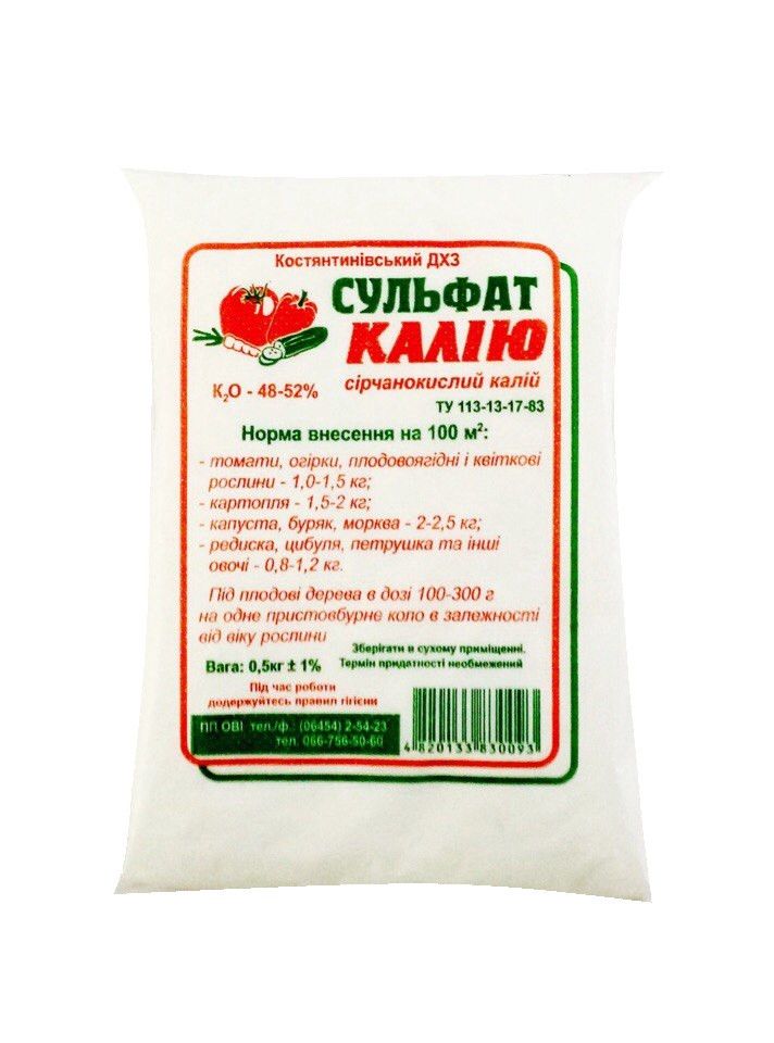 Сульфат калия - концентрированное удобрение из окиси калия, которое очень эффективно используют при выращивании сельскохозяйственных культур, восприимчивых к хлору, а также овощей семейства крестоцветных. Сульфат калия полностью растворяется в воде, поэтому его часто применяют для внекорневых подкормок (с помощью оросителей, опрыскивателей). Применение сульфата калия способствует вымыванию хлора из почвы, улучшению качества почвы и повышению урожайность.