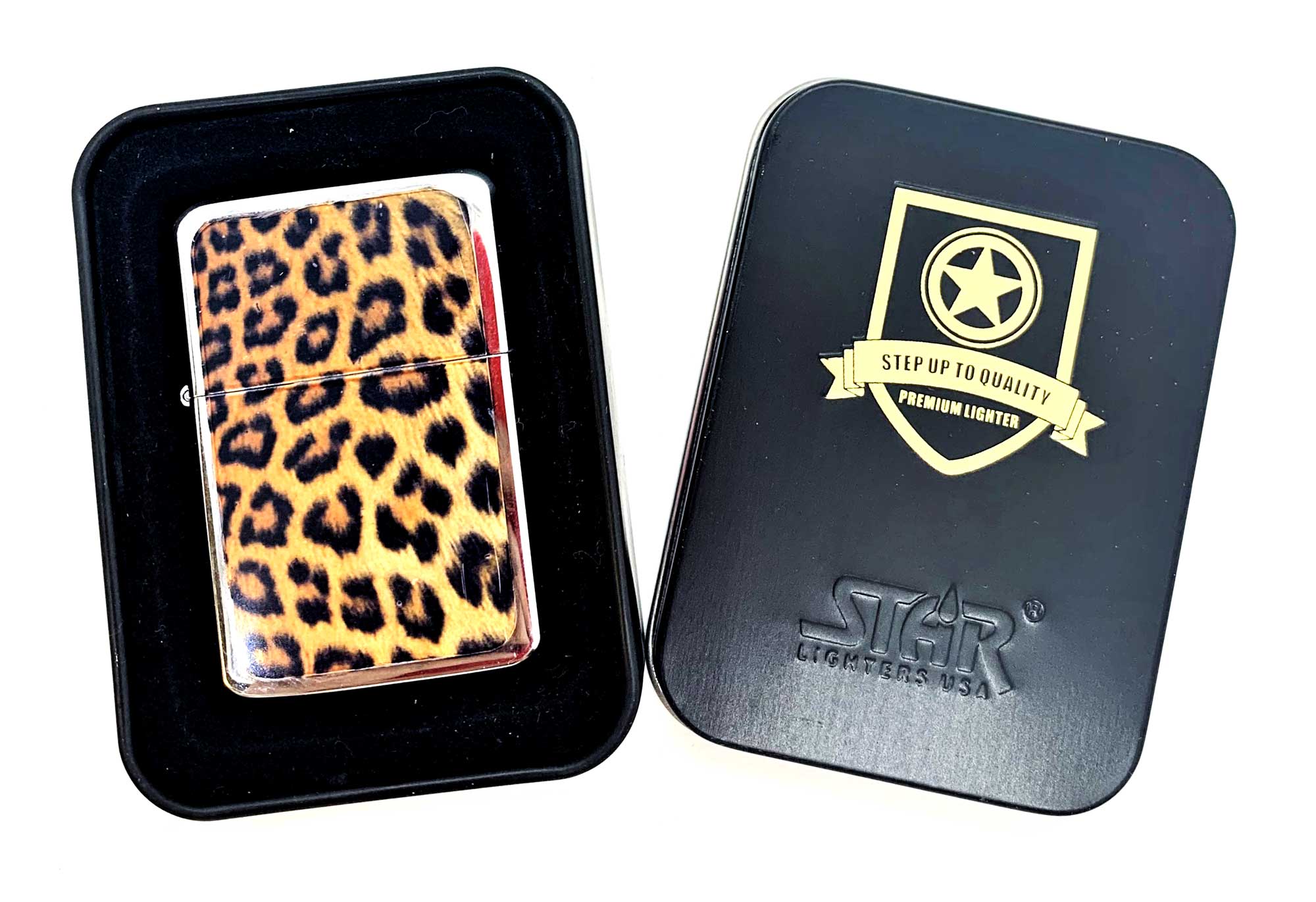 Зажигалка Star имеет привлекательный дизайн с леопардовым принтом с одной стороны, который придает ей смелый и модный вид. С другой стороны она выполнена в серебристом цвете, что добавляет элегантности и стиля.