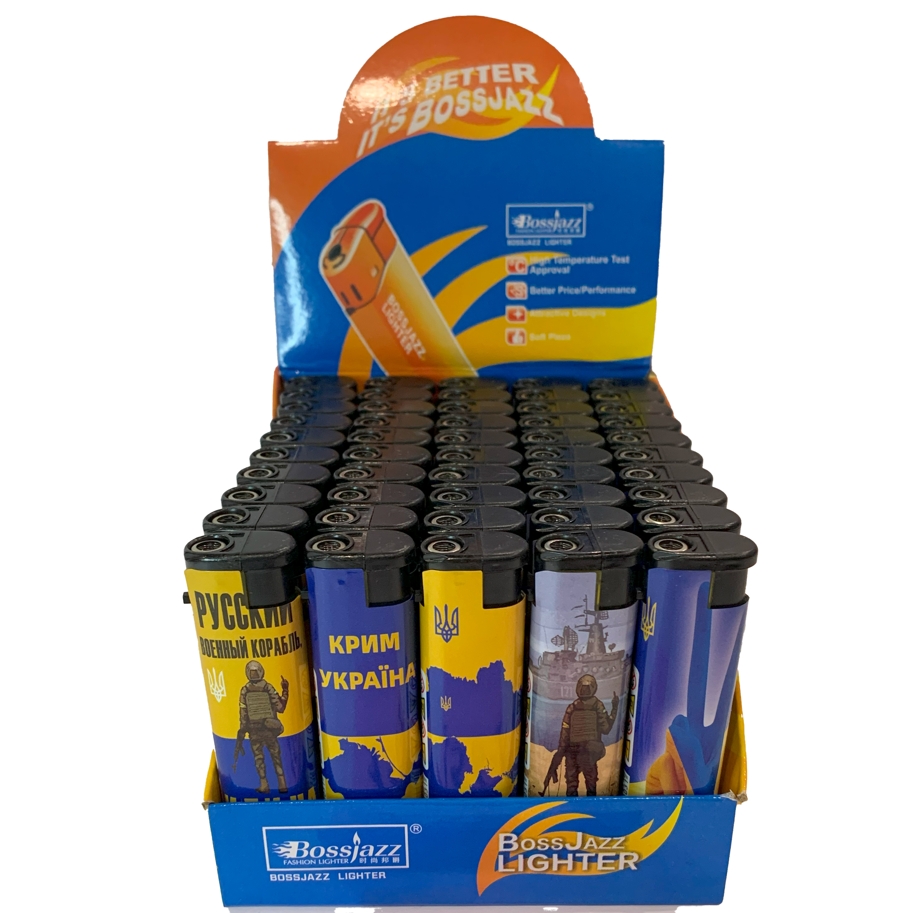 Газовые зажигалки BOSSJAZZ с патриотическим дизайном, вдохновлённым Украиной. Эти зажигалки выполнены в национальных цветах – синем и жёлтом – и украшены символикой, картой страны и мотивирующими надписями.