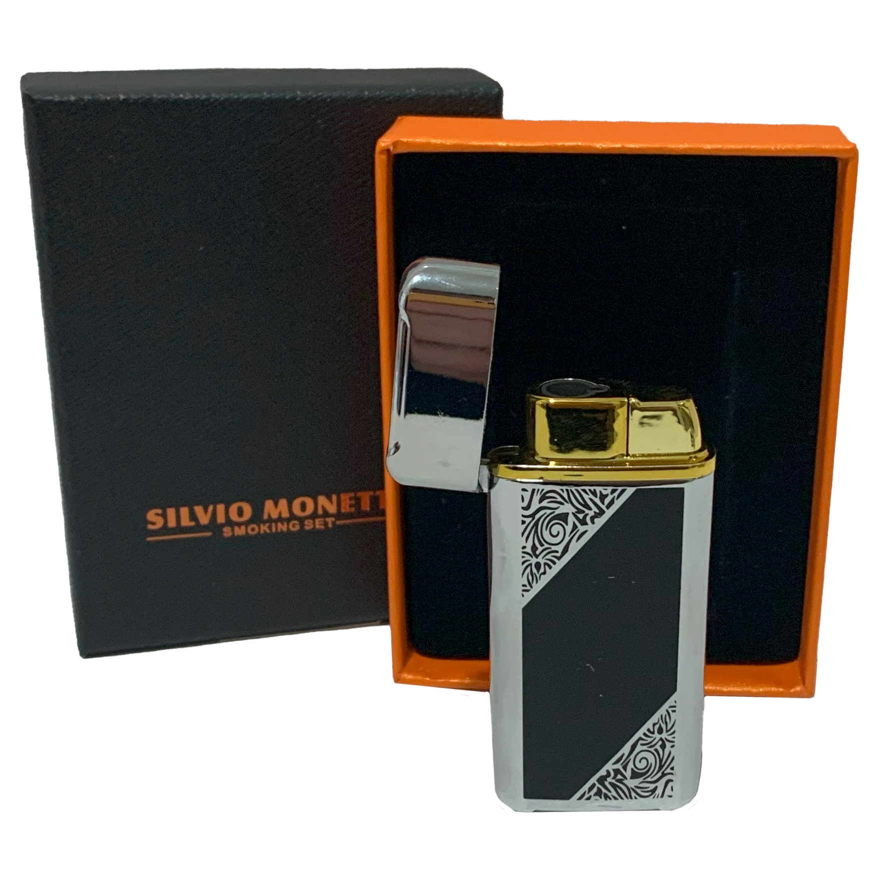Зажигалка Silvio Monetti – стильный и надежный аксессуар для ценителей классического дизайна и качественного исполнения. Выполненная из прочного металла с изысканными узорами, она станет отличным подарком или стильным дополнением к вашему образу.