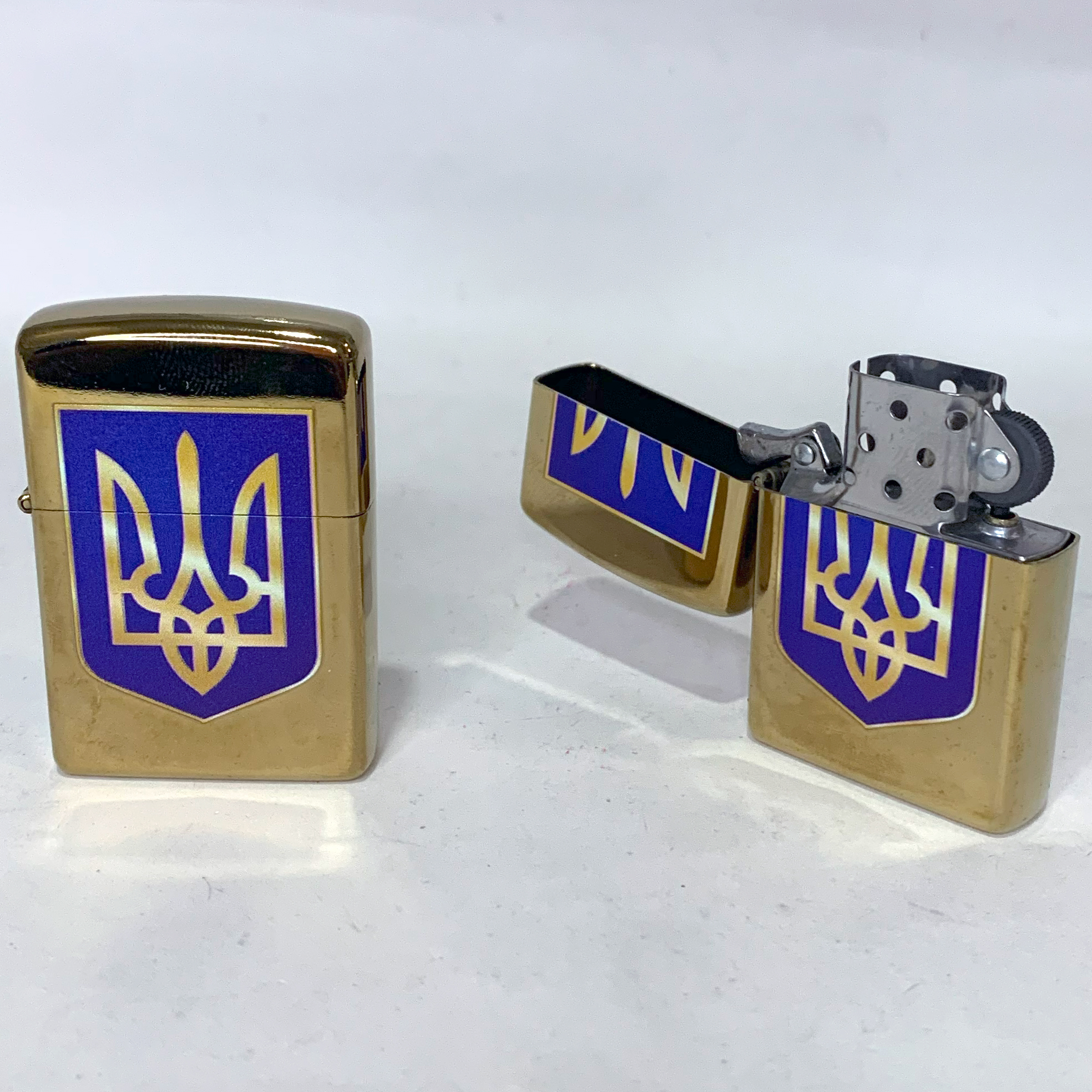 Стильная и надёжная бензиновая зажигалка с золотистым корпусом и вставкой с синим фоном и гербом Украины (Трезуб). Отличный выбор для подарка, коллекции или повседневного использования.