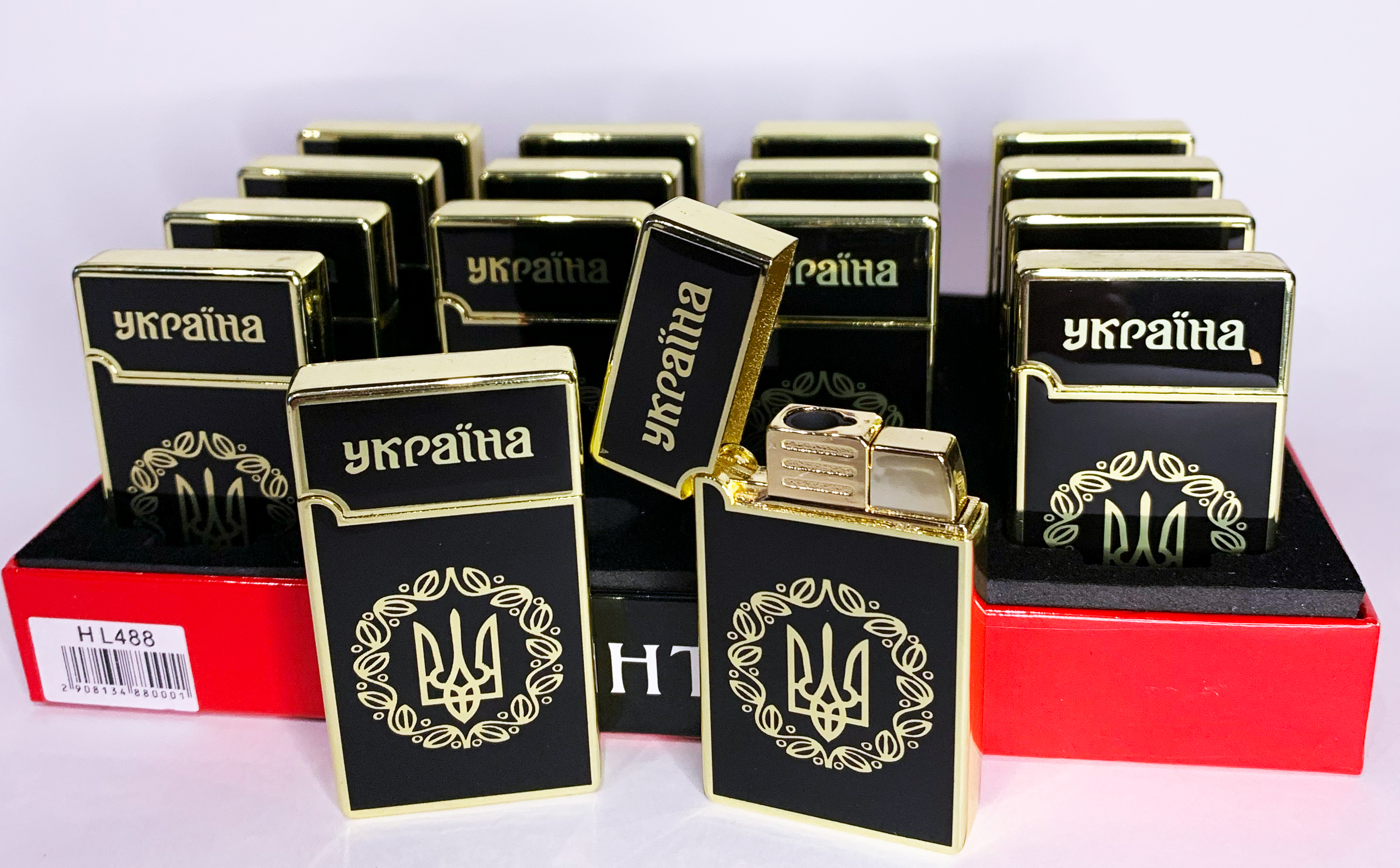 Зажигалка в подарочной коробке 100 гривен (Острое пламя, Фонарик) №UA-18