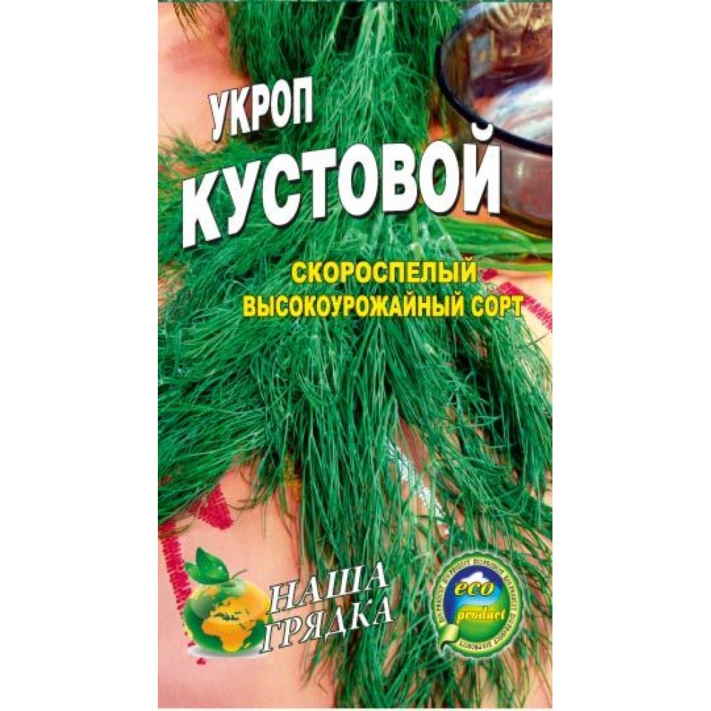 "Кустовой"Нежный, ароматный, кустовой сорт укропа. Скороспелый сорт. Формирует невысокий компактный куст. Зелень сформирована из 7-8 листьев, готова к уборке через 30-40 дней. Высевать можно на протяжении всего лета, начиная в самые ранние сроки через каждые 10-15 дней. Возможен посев укропа под зиму для получения ранней продукции. Сорт долго не теряет товарных качеств. Используют в свежем и сушеном виде, а также для засолки.