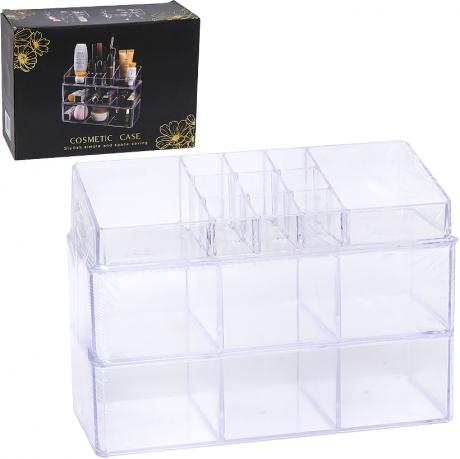 Крім косметики в нього можна скласти ювелірні вироби та пензлі для нанесення макіяжу. Безбарвний пластик дозволяє бачити всю косметику та аксесуари. Розмір оргонайзера 23*9.5*17см