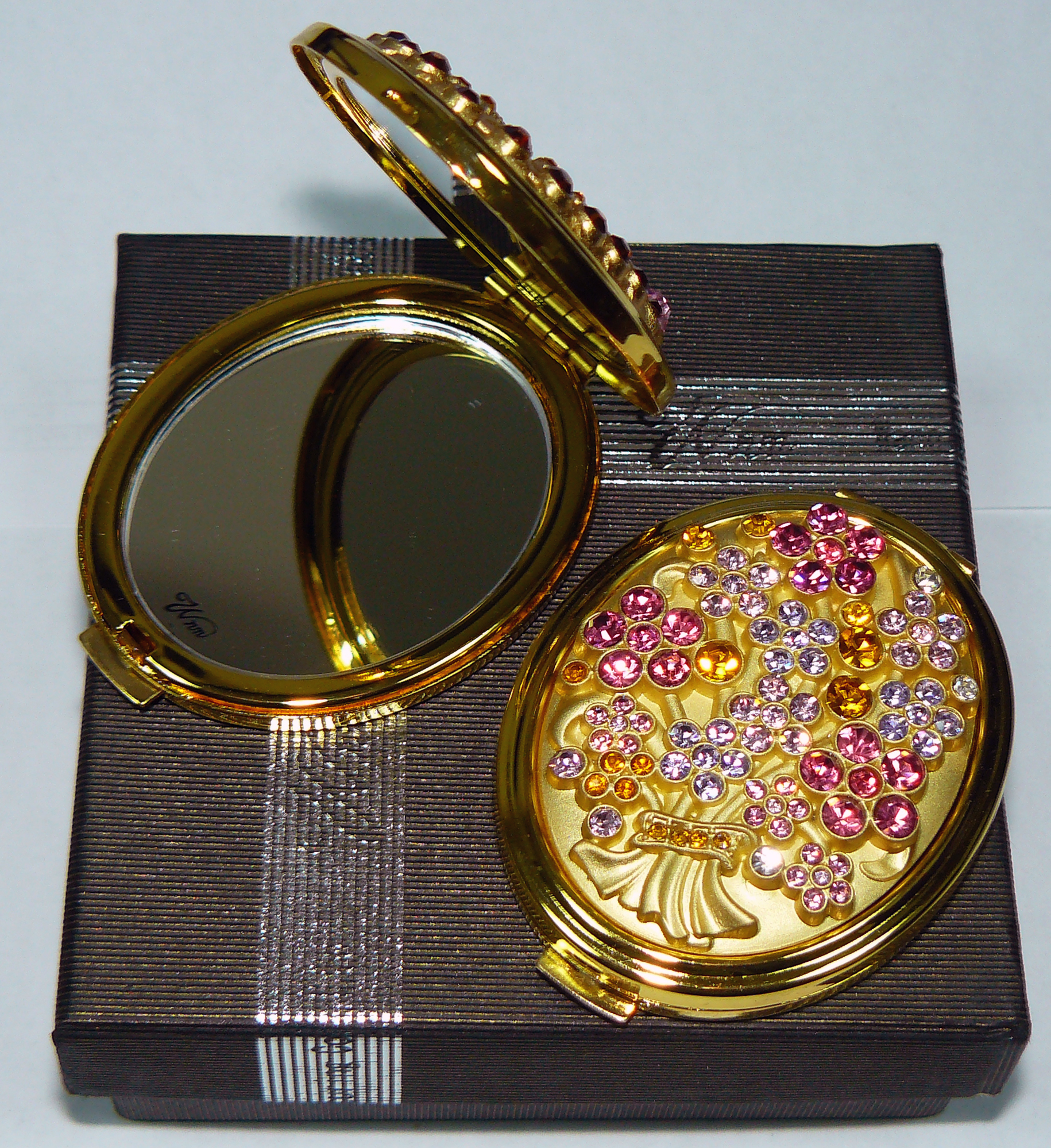Зеркальце косметическое Узор с камнями золото (d-7 см) (в коробке + чехольчик)