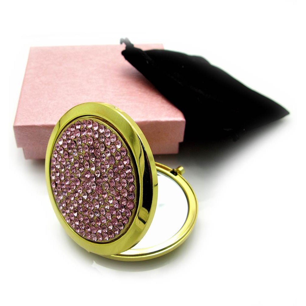 Зеркальце косметическое Стразы золото 18583 Розовый (в коробке + чехольчик)