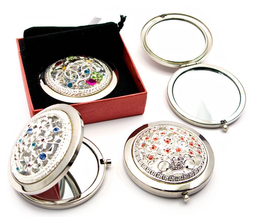 Зеркальце косметическое Узор с камнями хром (d-7 см)(в коробке + чехольчик)c