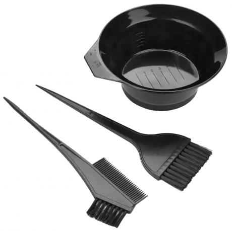 Цей набір для фарбування волосся включає пензлик, пензлик-гребінець та мисочку для змішування фарби. Всі елементи виготовлені з пластику. Об'єм мисочки становить 180 мл, а її розміри - 13х14х5 см.