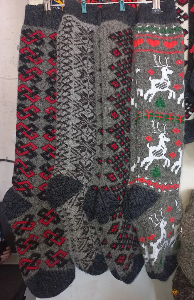 Носки из 100%шерсти.Шерстяные носки обладают целебным,согревающим эффектом.Позволят чувствовать себя комфортно в обуви и без.Мягкие,теплые,украшенные всевозможными принтами,поднимут настроение в холодную,сырую погоду,а также согреют в лютые морозы.На нашем сайте вы найдете широкий ассортимент носков,изделий для бани,устилок из натуральной шерсти.