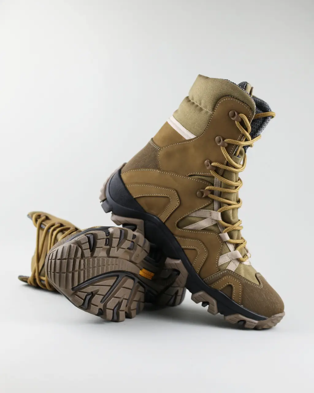 Верх выполнен из гидрофобного натурального нубука и водонепроницаемой ткани Cordura, берцы гарантируют непревзойденный комфорт при активных физических нагрузках. Кожа придает износостойкости, а дышащие свойства ткани обеспечивают вентиляцию, что важно во время длительных задач.