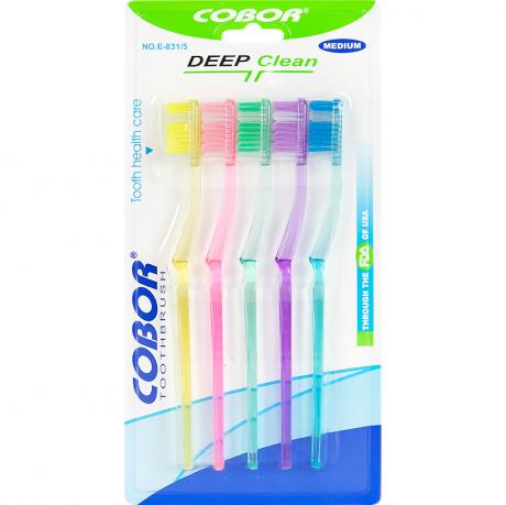 Набір зубних щіток «Cobor» Е831-5 призначений для щоденної гігієни ротової порожнини та підходить для домашнього й професійного використання. У комплект входять 5 зубних щіток довжиною 19 см, розміщених на одному блістері. Щітки оснащені синтетичною щетиною, яка ефективно видаляє зубний наліт і залишки їжі, забезпечуючи якісне очищення поверхні зубів і міжзубних проміжків. Розмір головки становить 3×1,5 см, що забезпечує зручність у використанні та доступ до важкодоступних ділянок. Блістер розміром 12,5×26 см зручний для зберігання та викладки.