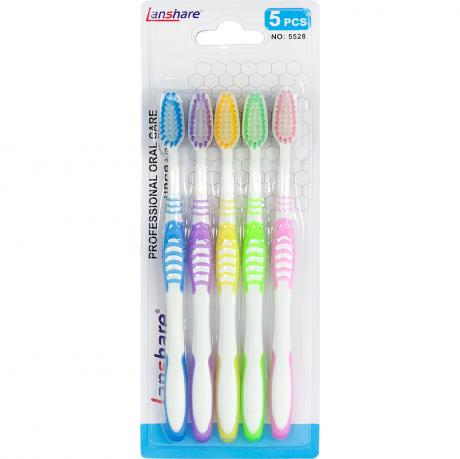 Набір зубних щіток «Lanshare» 5526/5528 призначений для щоденної гігієни ротової порожнини та зручний для сімейного використання. У комплект входять 5 зубних щіток довжиною 18 см, розміщених на одному блістері. Щітки оснащені синтетичною щетиною, яка ефективно видаляє зубний наліт і залишки їжі, забезпечуючи якісне очищення поверхні зубів і міжзубних проміжків. Розмір головки 3×1 см дозволяє легко очищати важкодоступні ділянки без подразнення ясен. Ергономічна форма ручки забезпечує зручне утримання під час чищення. Блістер розміром 9×24 см зручний для викладки та захищає вироби під час зберігання і транспортування. Набір оптимально підходить для оптових інтернет-магазинів і роздрібної торгівлі.