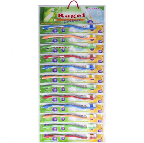 Зубні щітки «Ragel» 619A призначені для щоденної гігієни ротової порожнини та підходять для регулярного використання. Довжина щітки становить 18 см, що забезпечує зручне утримання та комфорт під час чищення зубів. Робоча головка розміром 3×1 см дозволяє ефективно очищати поверхню зубів і міжзубні проміжки, сприяючи якісному видаленню зубного нальоту та залишків їжі. Класична конструкція робить щітки зручними для домашнього застосування та продажу в роздріб. Вироби розміщені на загальному блістері розміром 23×48 см у кількості 12 штук. Кожна щітка має індивідуальний блістер 22×3 см, зручний для викладки й зберігання. Товар оптимально підходить для оптового продажу.