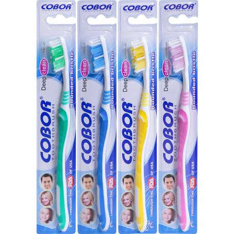 Пластикові гігієнічні зубні щітки «Cobor» із синтетичною щетиною хвилеподібної форми призначені для щоденного комплексного догляду за ротовою порожниною. Хвиляста щетина ефективно очищає поверхню зубів і міжзубні проміжки, допомагаючи видаляти наліт та залишки їжі без шкоди для емалі. Довжина зубної щітки становить 19 см, розмір головки — 3×1 см, висота щетинок — 1,2 см, що забезпечує комфорт і якісне чищення. На зворотному боці головки передбачена ребриста поверхня для очищення язика, яка сприяє зменшенню бактерій і підтриманню свіжого подиху. Кожна щітка має індивідуальну упаковку у блістері розміром 23×4 см з підвісом. Транспортна упаковка 23×12×6 см містить 12 блістерів і підходить для оптового продажу та роздрібної торгівлі.