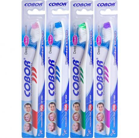 Пластикові гігієнічні зубні щітки «Cobor» із синтетичною щетиною хвилеподібної форми призначені для щоденного комплексного догляду за ротовою порожниною. Хвиляста щетина ефективно очищає поверхню зубів і міжзубні проміжки, допомагаючи видаляти наліт та залишки їжі без шкоди для емалі. Довжина зубної щітки становить 19 см, розмір головки — 3×1 см, висота щетинок — 1,2 см, що забезпечує комфорт і якісне чищення. На зворотному боці головки передбачена ребриста поверхня для очищення язика, яка сприяє зменшенню бактерій і підтриманню свіжого подиху. Кожна щітка має індивідуальну упаковку у блістері розміром 23×4 см з підвісом. Транспортна упаковка 23×12×6 см містить 12 блістерів і підходить для оптового продажу та роздрібної торгівлі.