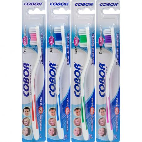 Пластикові гігієнічні зубні щітки «Cobor» із синтетичною щетиною хвилеподібної форми призначені для щоденного комплексного догляду за ротовою порожниною. Хвиляста щетина ефективно очищає поверхню зубів і міжзубні проміжки, допомагаючи видаляти наліт та залишки їжі без шкоди для емалі. Довжина зубної щітки становить 18 см, розмір головки — 3×1 см, висота щетинок — 1,2 см, що забезпечує зручність і якісне чищення. На зворотному боці головки розташована ребриста поверхня для очищення язика, яка сприяє зменшенню бактерій і підтриманню свіжого подиху. Кожна щітка упакована індивідуально у блістер розміром 23×3,5 см з підвісом. Транспортна упаковка 23,5×10×6 см містить 12 блістерів і оптимальна для оптового продажу та роздрібної торгівлі.