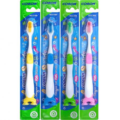 Дитячі зубні щітки «Cobor» на блістері Е-984 призначені для щоденної гігієни ротової порожнини у дітей. Довжина щітки становить 16 см, компактна головка розміром 2,5×1 см забезпечує зручне та дбайливе очищення дитячих зубів. Синтетична щетина ефективно видаляє наліт і залишки їжі, не пошкоджуючи емаль та чутливі ясна. Конструкція оснащена двома присосками, що дозволяють фіксувати щітку на рівній поверхні для гігієнічного зберігання у ванній кімнаті. Кожна щітка має індивідуальну упаковку у блістері розміром 23×3,5 см, зручному для викладки. Транспортна упаковка 6×10×23 см підходить для зберігання та оптових поставок у торгові мережі.