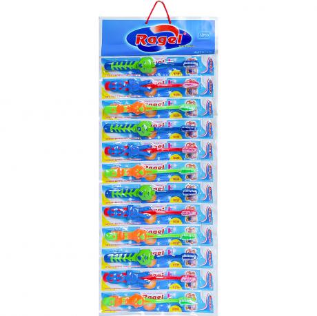 Дитячі зубні щітки «Ragel» MIX3 призначені для щоденної гігієни ротової порожнини у дітей та допомагають перетворити чищення зубів на приємну звичку. Довжина щітки становить 16 см, що зручно для дитячої руки. На ручці розміщені декоративні елементи у вигляді звіряток, які заохочують дитину регулярно доглядати за зубами. Робоча головка довжиною 3 см забезпечує дбайливе та ефективне очищення без пошкодження емалі й ясен. Щітки розміщені на загальному блістері розміром 48×20 см у кількості 12 штук. Кожна щітка має індивідуальний блістер 18×3 см, зручний для зберігання та викладки. Товар оптимально підходить для оптового продажу та роздрібної торгівлі дитячими товарами.