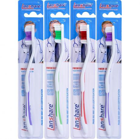 Зубні щітки «Lanshare» призначені для щоденної гігієни ротової порожнини та підходять для регулярного використання. Довжина щітки становить 19 см, що забезпечує зручне утримання й комфорт під час чищення. Робоча головка розміром 3×1 см дозволяє ефективно очищати поверхню зубів і важкодоступні ділянки. Синтетична щетина сприяє якісному видаленню зубного нальоту та залишків їжі без шкоди для емалі та ясен. На зворотному боці головки розташована ребриста поверхня для очищення язика, яка допомагає зменшувати кількість бактерій і підтримувати свіже дихання. Індивідуальна упаковка — блістер 23×4 см — зручна для викладки. Транспортна упаковка 6×11×23,5 см містить 12 щіток і підходить для оптового продажу.