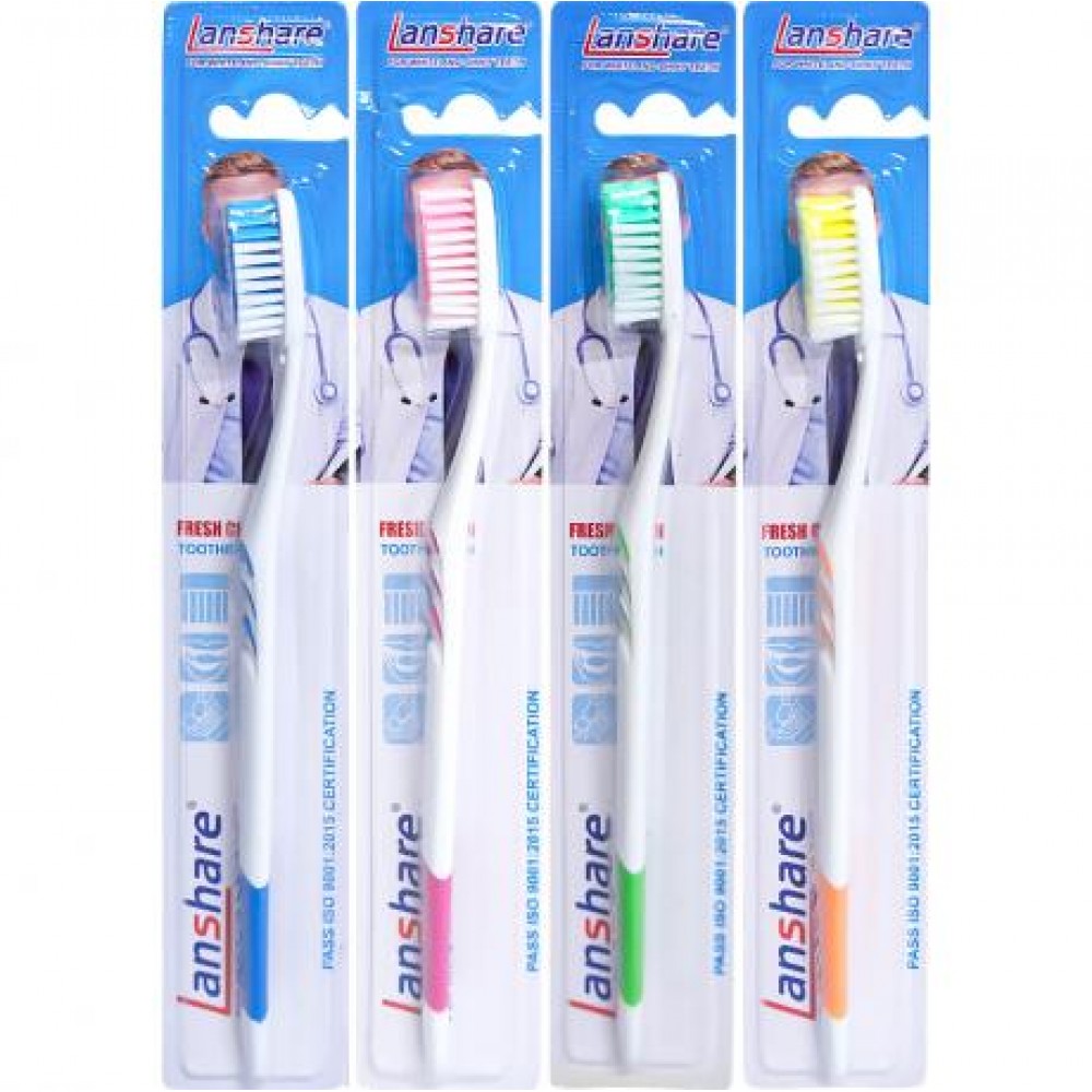 Зубні щітки «Lanshare» призначені для щоденної гігієни ротової порожнини та підходять для регулярного використання. Довжина щітки становить 19 см, що забезпечує зручне утримання й комфорт під час чищення. Робоча головка розміром 3×1 см дозволяє ефективно очищати поверхню зубів і важкодоступні ділянки. Синтетична щетина сприяє якісному видаленню зубного нальоту та залишків їжі без шкоди для емалі та ясен. На зворотному боці головки розташована ребриста поверхня для очищення язика, яка допомагає зменшувати кількість бактерій і підтримувати свіже дихання. Індивідуальна упаковка — блістер 23×4 см — зручна для викладки. Транспортна упаковка 6×11×23,5 см містить 12 щіток і підходить для оптового продажу.